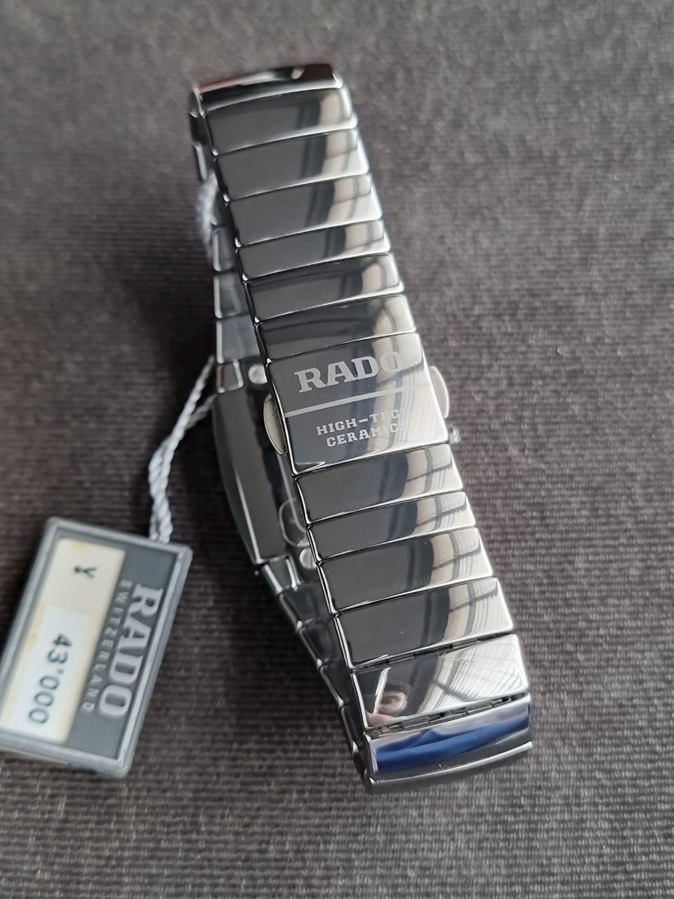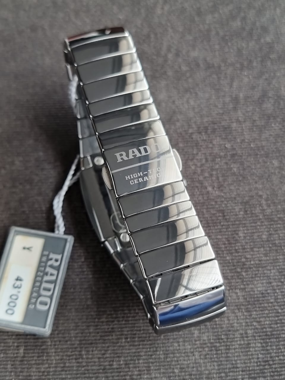 Diamonds set at the 3, 6, 9 and 12 o'clock position. Rado name appears below the 12 o'clock positionBEZEL