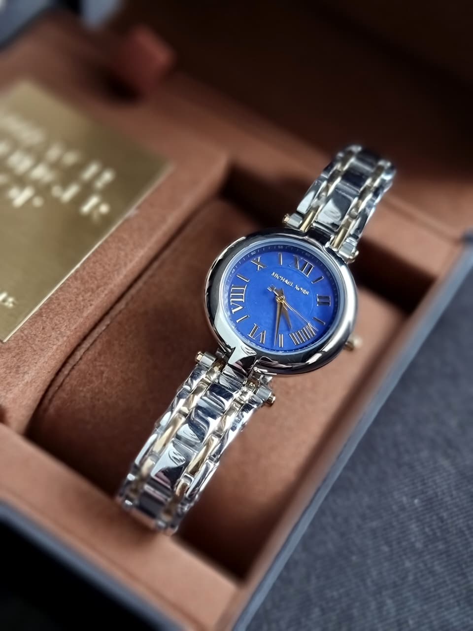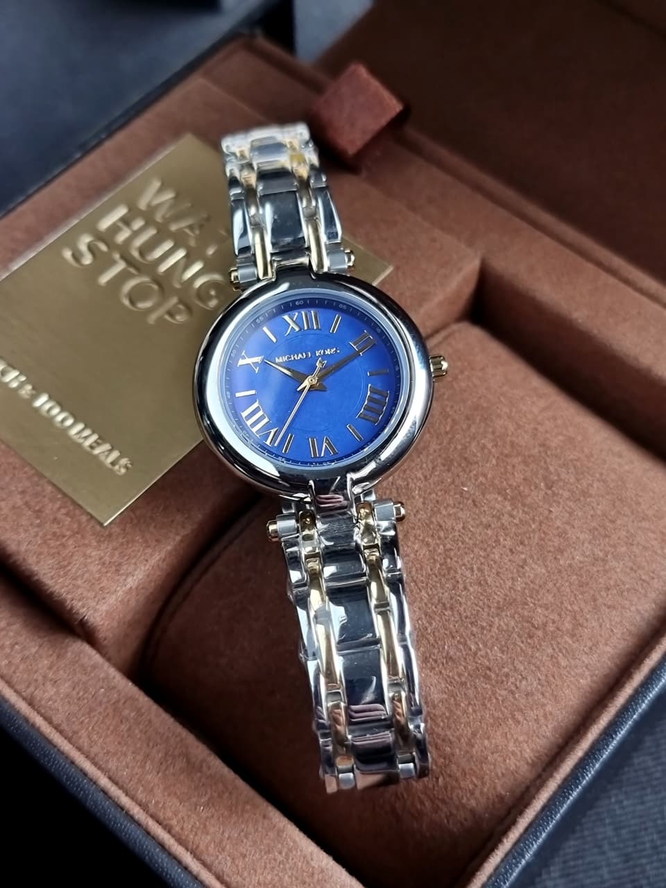 Michael Kors Two Tone Ladies Watch - MKO1085 Band Type: Bracelet Band Color: Two Tone Case Color: Two Tone Case Size: 38 mm Clasp: Push Button Clasp Dial Color: Blue Movement: Quartz