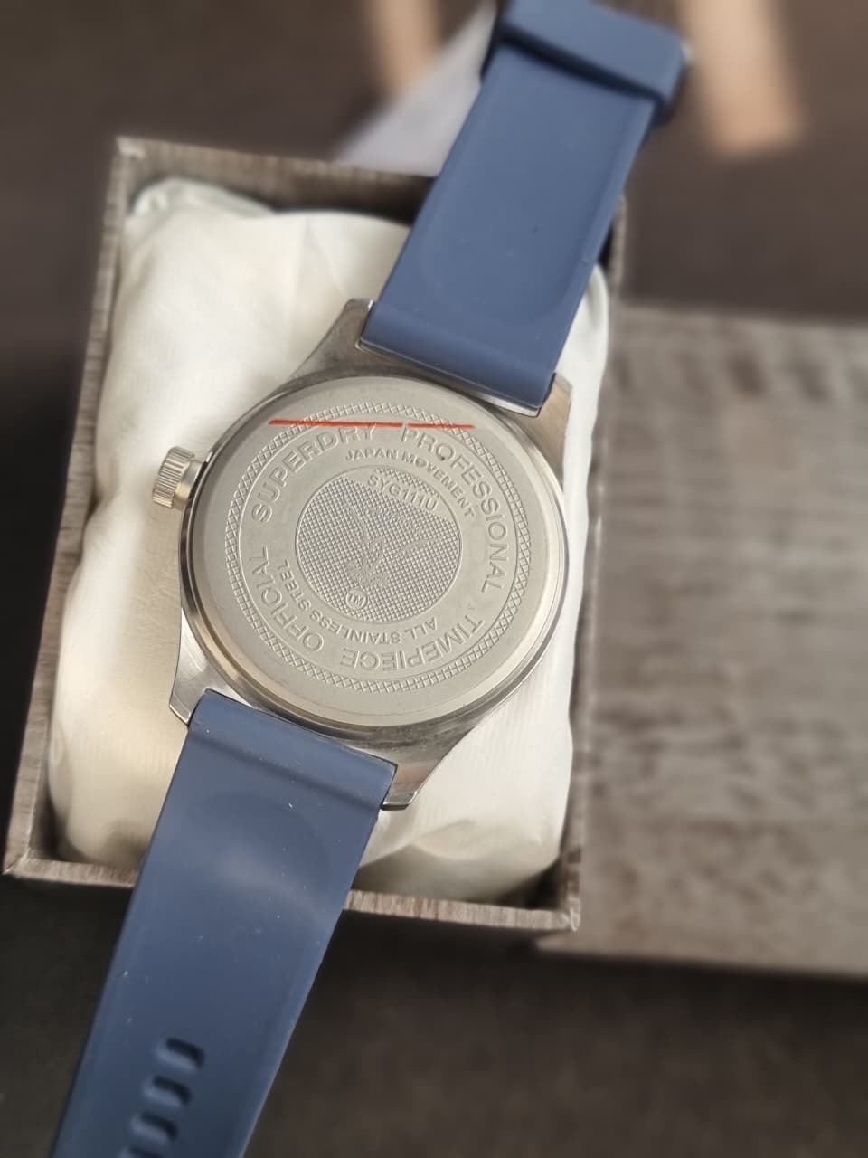 Brand, Seller, or Collection Name Superdry Model Number SYG111U Part Number SYG111U Item Shape Round Display Type Analog Clasp Type Buckle Case material Stainless Steel Case diameter 49 millimeters Case Thickness 12 Centimetres Band Material Rubber Band width 21 Band Colour Blue Dial colour Black Special features Water Resistant Movement...