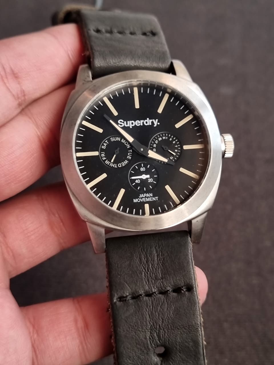 Band Colour Black Band Material Leather Brand Superdry Clasp Tang Buckle Collection Chronograph Dial Colour Black Display Type Analog Case Shape Round Model Number SYG104B Part Number SYG104B Special Features Water Resistant Warranty Type Manufacturer Movement Quartz Water Resistance Depth 3 Meters
